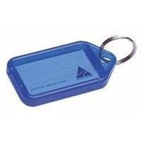 Kevron plastic clicktags with 35x22mm insert card. Cover clicks to secure insert. 19mm stainless steel keyring. Blue.