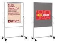 Bi-Office Duo Easel. Double-sided, aluminium framed, mobile easel with a melamine drywipe board on one side and a Grey felt pinning surface on the other. Completely mobile and fitted with locking castors. Size: 1200mmx790mm.