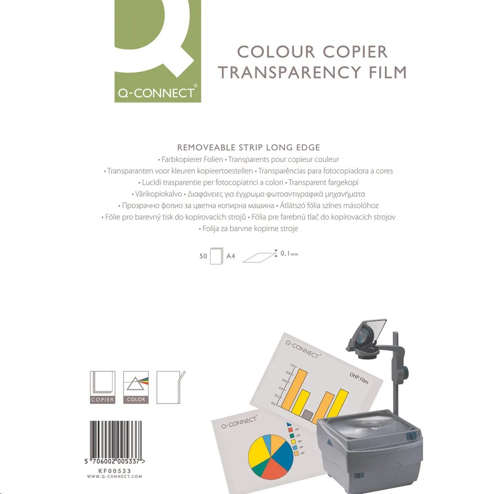 This Q-Connect Copier Film is ideal for over head projection that is clear and sharp. With the same sharp printing that you would expect from a laser printer, you can be sure that colour and black and white prints keep the same high definition. When you really need to impress with a presentation, this is the perfect way to ensure that you can have the highest quality visual aid possible. These films are easy to print and even simpler to use.